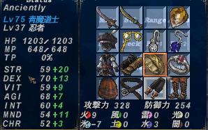 サブ : イフリートブレード[片手剣]D36 隔236 STR+3 攻+10 追加効果:火ダメージ Lv65~ 戦シ暗獣狩侍青(ER